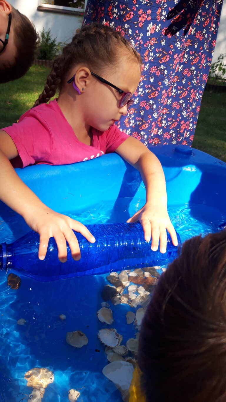 Poszukamy w wodzie kamyków, muszelek.Przywieźliśmy z wakacji skarbów tak wiele. W naszym przedszkolu wspominaliśmy wakacje. Korzystając z przepięknej pogody stworzyliśmy własne morze z muszelkami i kamykami. W basenie dzieci czuły się jak ryby w wodzie. Skakały, śpiewały – radości nie…