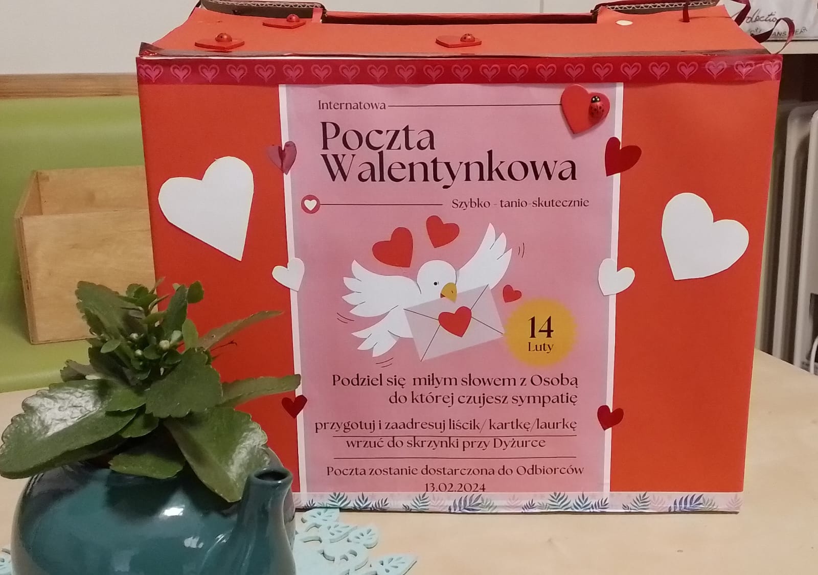 Jak co roku 14 lutego w Internacie Dziewcząt był świętowany Dzień Zakochanych. Kilka tygodni przed świętem zaczęła funkcjonować Poczta Walentynkowa – szybka, tania i oczywiście skuteczna. Dzięki tej poczcie można było podzielić się miłym słowem z osobą do której czuje się sympatię i wysłać „Walentynkę”. Najważniejsze, aby kartki były anonimowe i rozgrzewały emocje i domysły od kogo jest „Walentynka?” Ponadto w wielu miejscach pojawiły się ozdoby w postaci czerwonych serc – symbolu miłości.