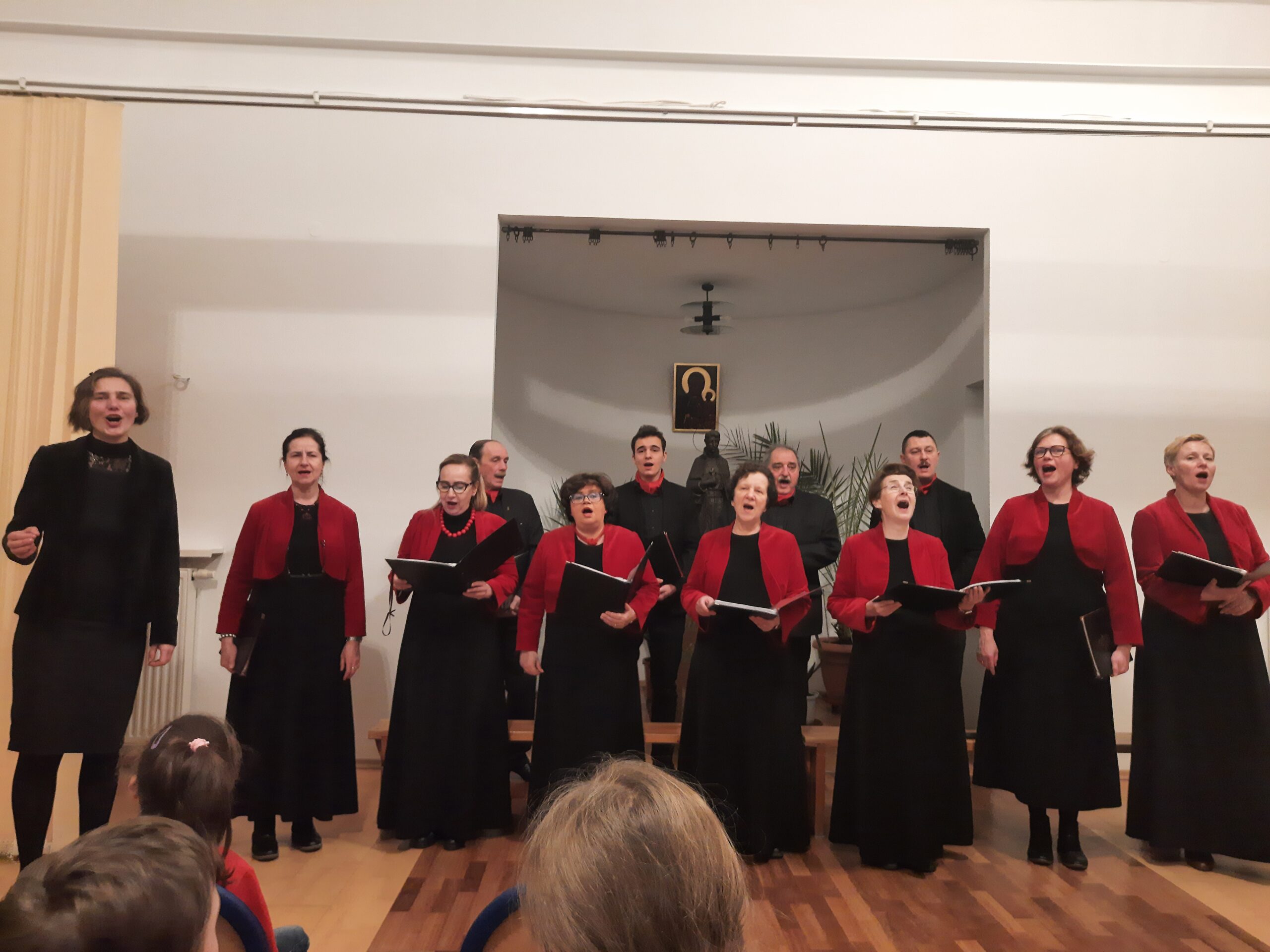Wspólnie z chórem przybyli uczestnicy mogli zaśpiewać wiele znanych kolęd: „Do szopy hej pasterze”, „Przybieżali do Betlejem”, „Dzisiaj w Betlejem”, „Oj maluśki” . Podczas wspólnego śpiewu kolęd akompaniowała Ewa Hryniewicka. Z ciekawostek o których mogliśmy się dowiedzieć, to fakt, że w chórze śpiewa tylko jeden tenor. Ten godzinny występ szybko minął w miłej atmosferze a na koniec Pani Emilia zaprosiła chętne wychowanki na scenę i wspólnego śpiewu kolędy „Bóg się rodzi”.